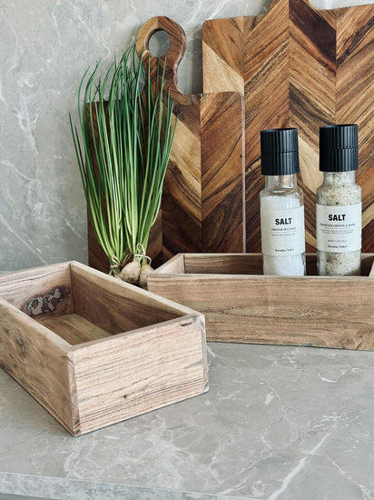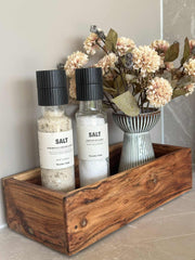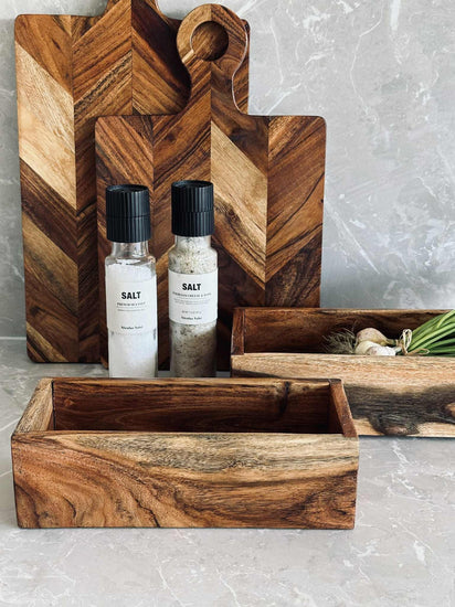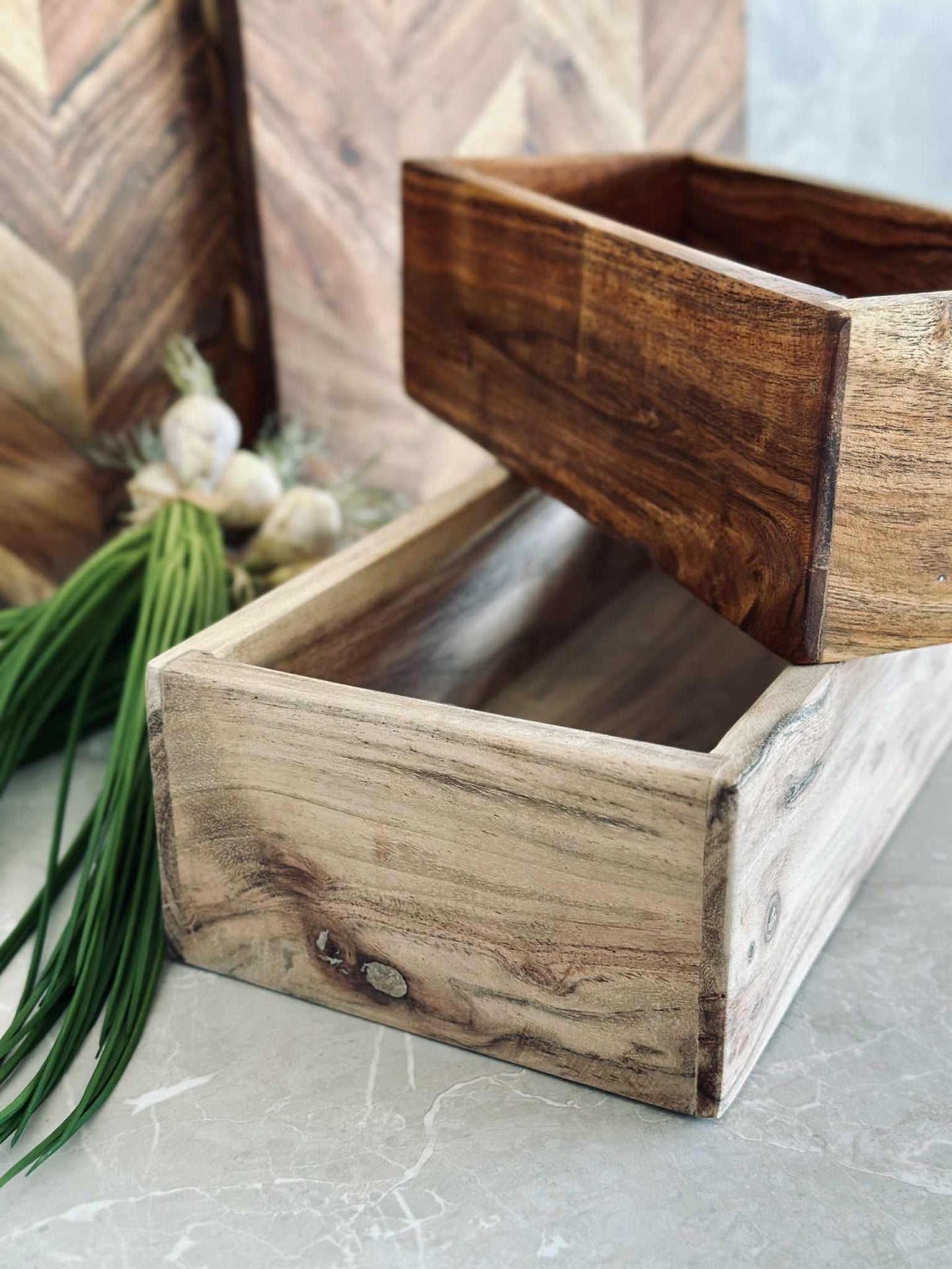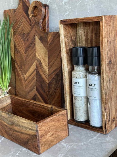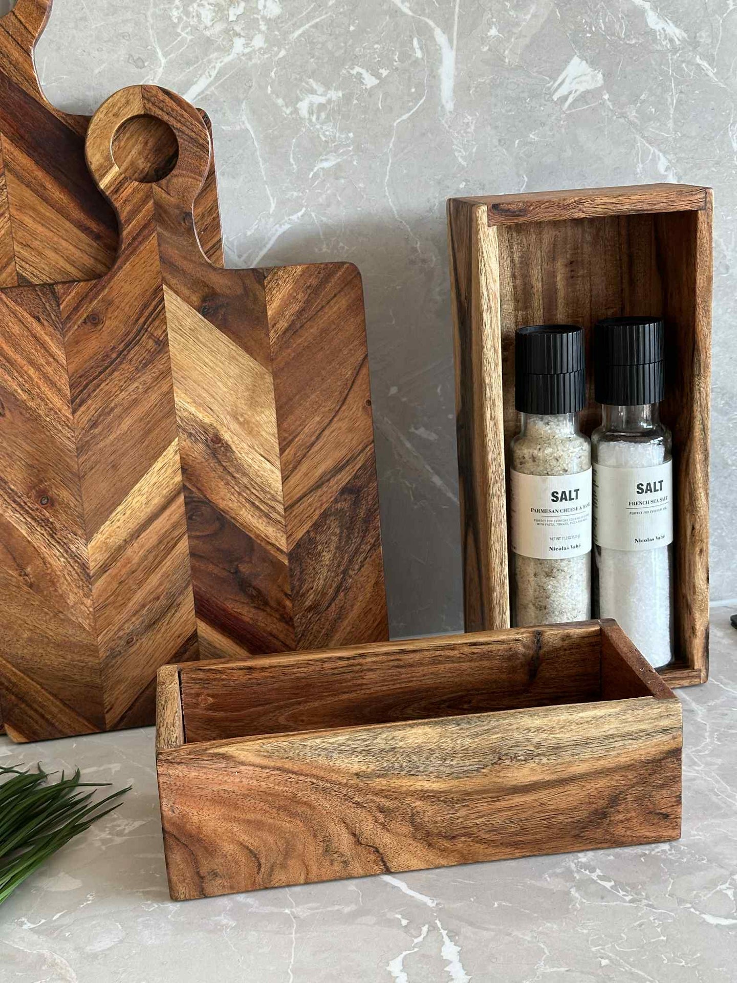 Gefertigt aus hochwertigem Akazienholz bieten diese Aufbewahrungsboxen eine robuste und natürliche Lösung für Ihre Küchenorganisation. Das Holz ist bekannt für seine Widerstandsfähigkeit gegenüber Feuchtigkeit, was es ideal für den Einsatz in der Küche macht. Darüber hinaus verleiht die warme Holzfarbe Ihrem Raum eine einladende Atmosphäre und fügt sich harmonisch in verschiedene Einrichtungsstile ein.