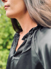 Die Bluse ist einfarbig in Schwarz und erscheint minimalistisch im Ausdruck. Das Material ist eine Mischung aus 70% Viskose und 30% Seide.