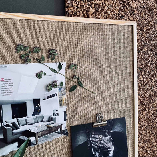 Aus klassischem Hessiastoff gefertigte Natur-Pinnwand
