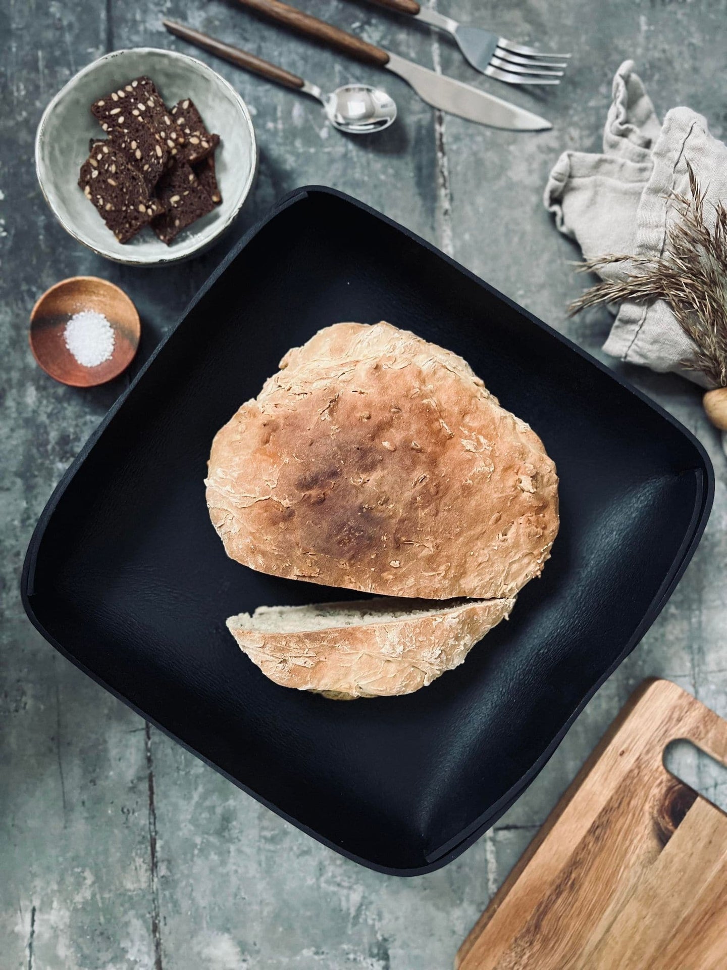 Erleben Sie Flexibilität und Eleganz in Ihrem Alltag mit diesem vielseitig einsetzbaren Tablett in schwarzem Leder. Ideal für ein stilvolles Frühstück oder zur ordentlichen Aufbewahrung von Gegenständen. Robust und funktional, verbessert es Ihr Lebensstil ganz subtil.